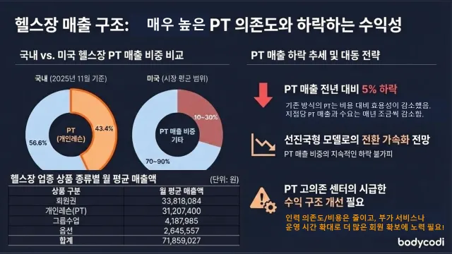 이에 비해서 국내 헬스장은 여전히 PT 매출의 의존도가 매우 높은 것을 확인할 수 있었습니다.