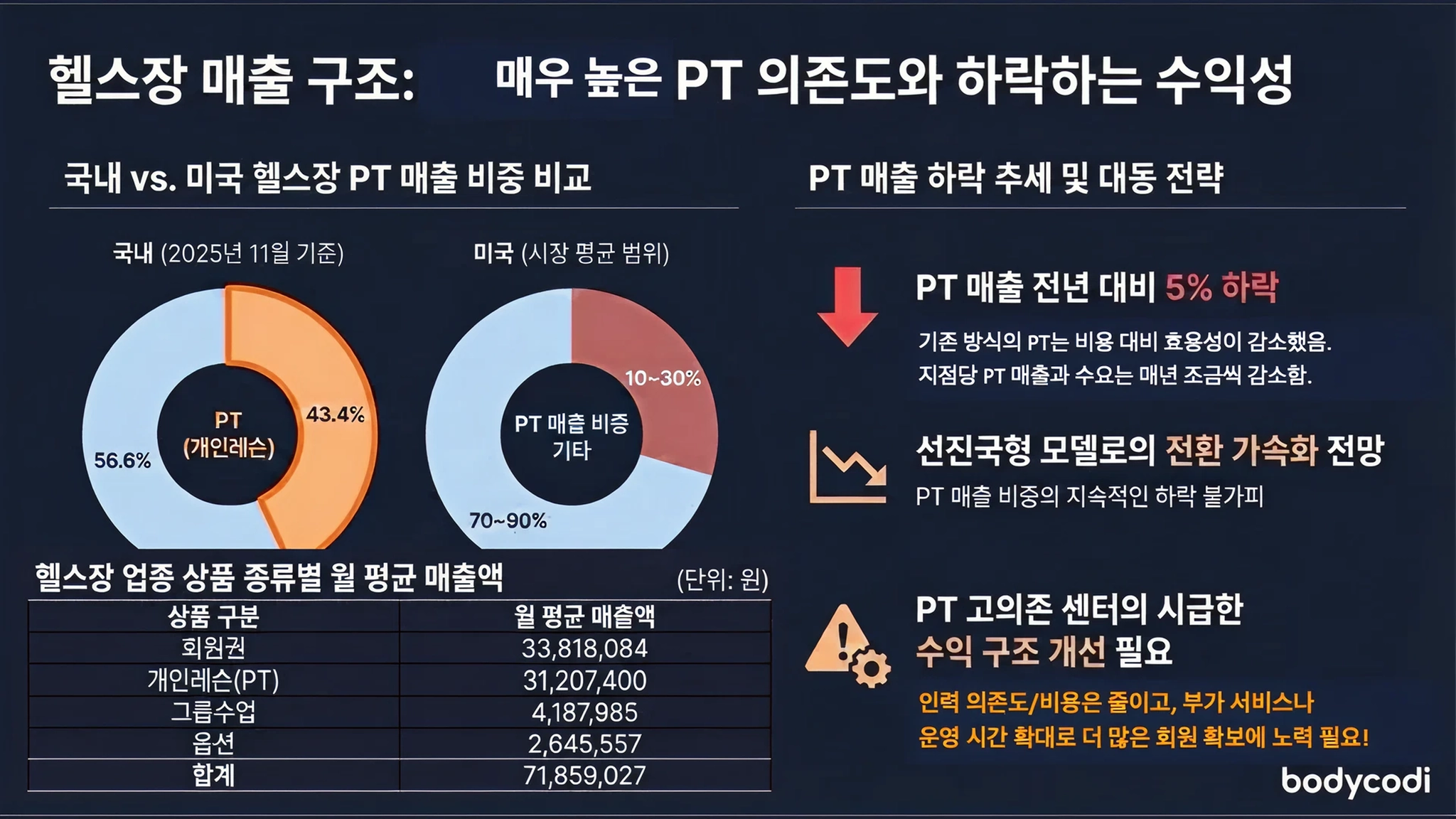 현재 국내 헬스장의 매출 구조는 **회원권(56.6%) vs PT(43.4%)**로, PT에 대한 의존도가 매우 높습니다.