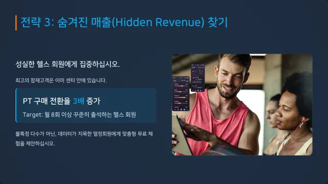 헬스장 이용권만 쓰면서도 한 달에 8번 이상 꾸준히 나오는 회원들, 즉 운동 의지가 높은 여성 회원분들에게 PT 무료 체험을 제안했을 때, 구매로 이어질 확률이 다른 회원들에 비해 3배 까지 높았습니다.