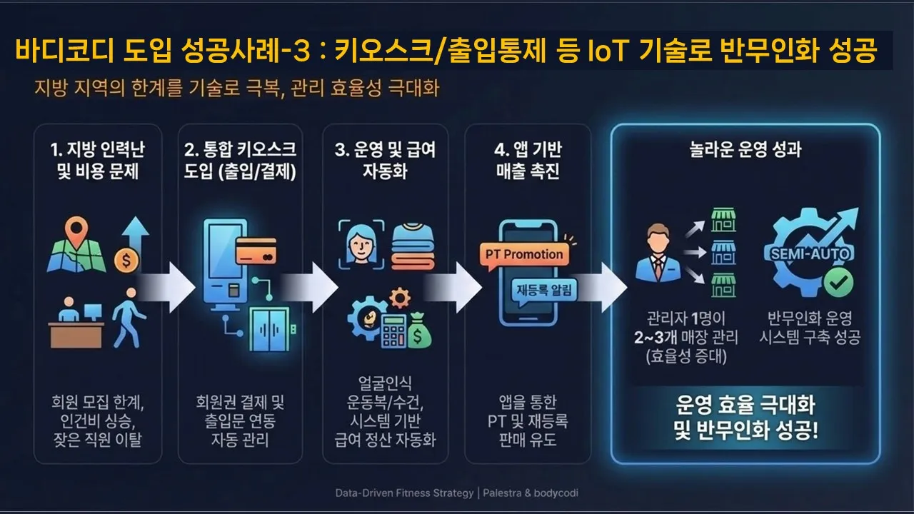 성과: 관리자 1명이 2~3개 지점을 동시에 관리하는 '반무인화'에 성공하여 운영 이익률을 획기적으로 개선