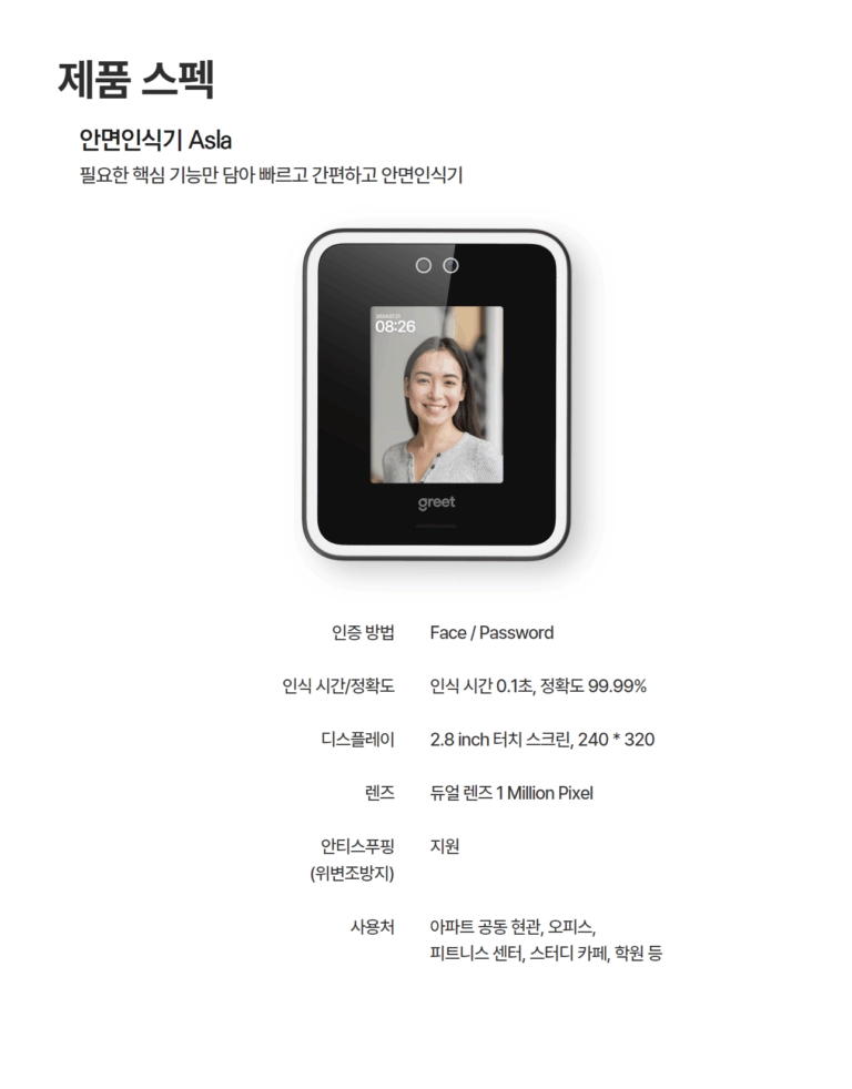 Greet(참깨)은 센터 출입·체크인을 위한 안면인식 하드웨어 장치입니다.