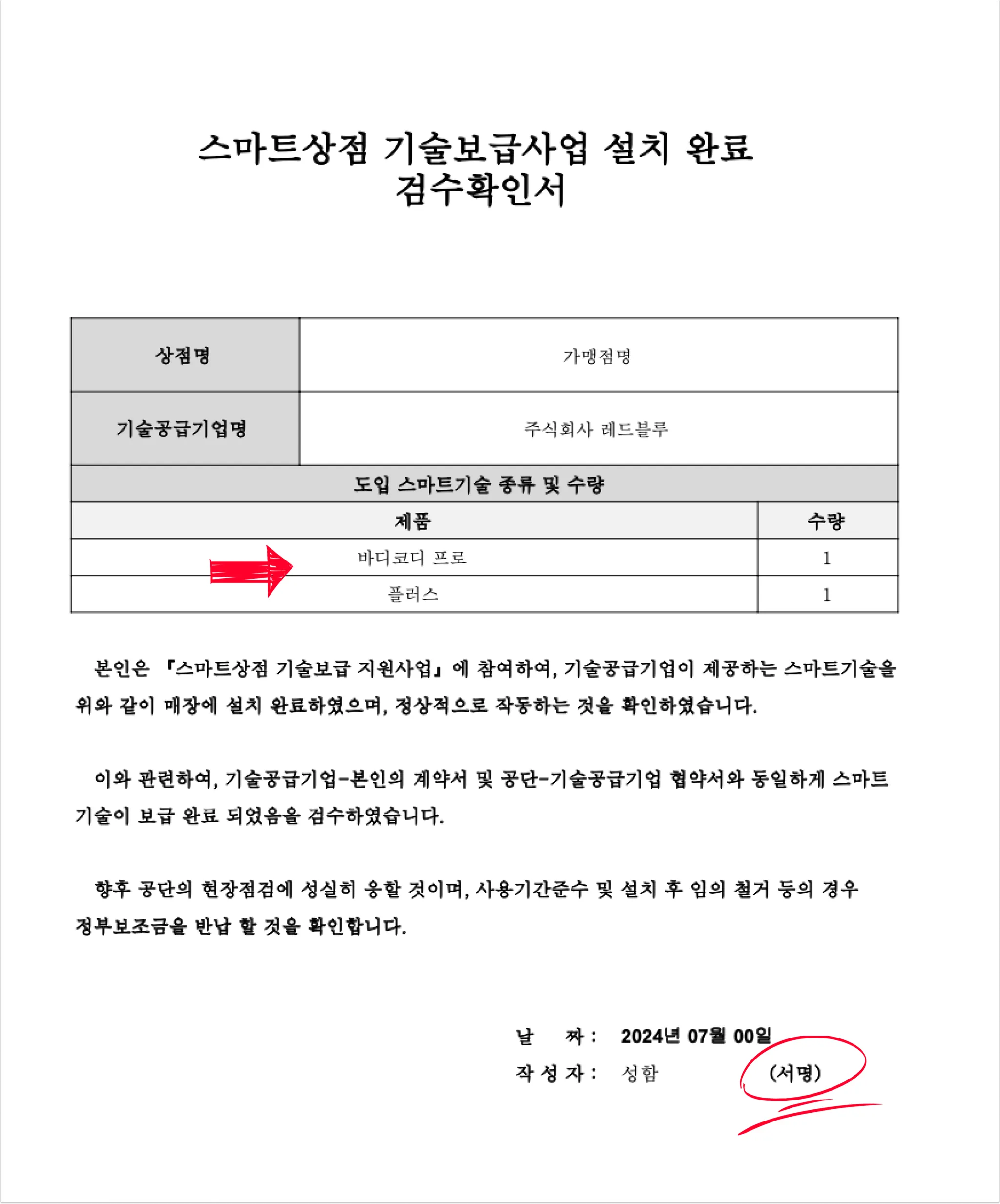 스마트상점을 통해 바디코디 계약까지 완료하셨다면, 검수확인서 및 사진 자료 제출이 필요합니다.