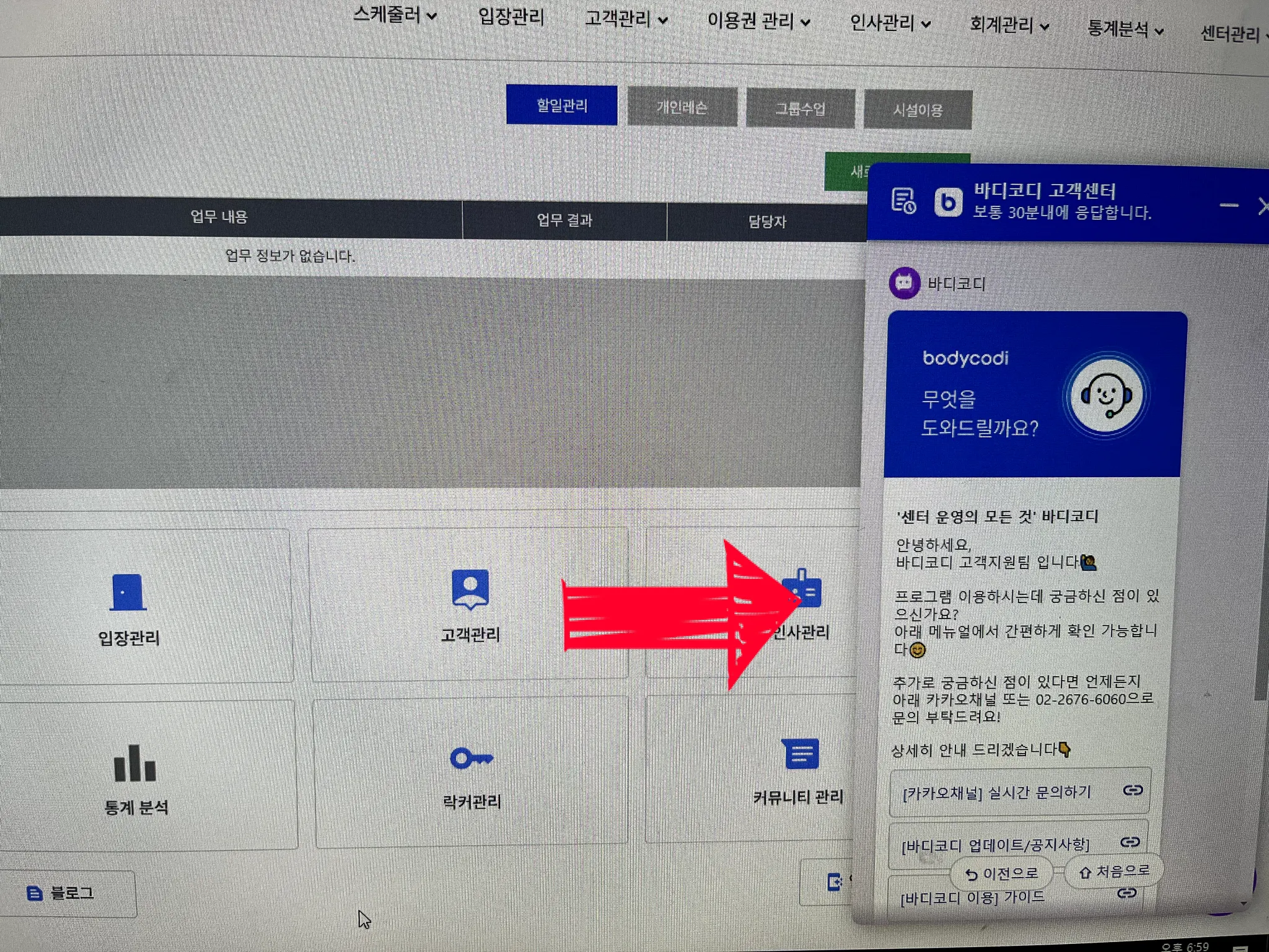 바디코디 실행 후, 우측 하단 문의 버튼을 눌러 고객센터 접속한 모니터 화면을 촬영해주세요.