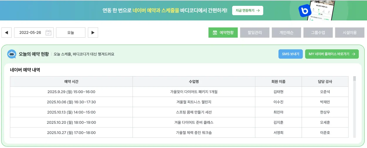 바디코디 CRM에서도 네이버 예약 현황을 편하게 확인할 수 있습니다!