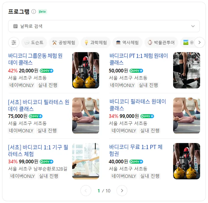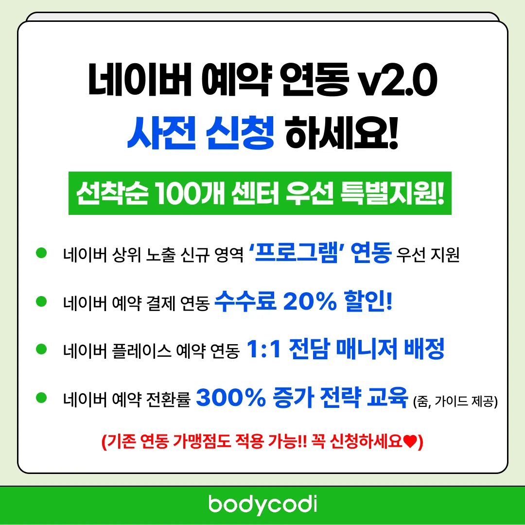 네이버에서 검색하면 플레이스처럼 ‘프로그램’ 영역에 노출되는데, 11월에 업데이트 되는 [네이버 예약 연동 v 2.0]에서 피트니스 업계 최초로 바디코디가 연동합니다.