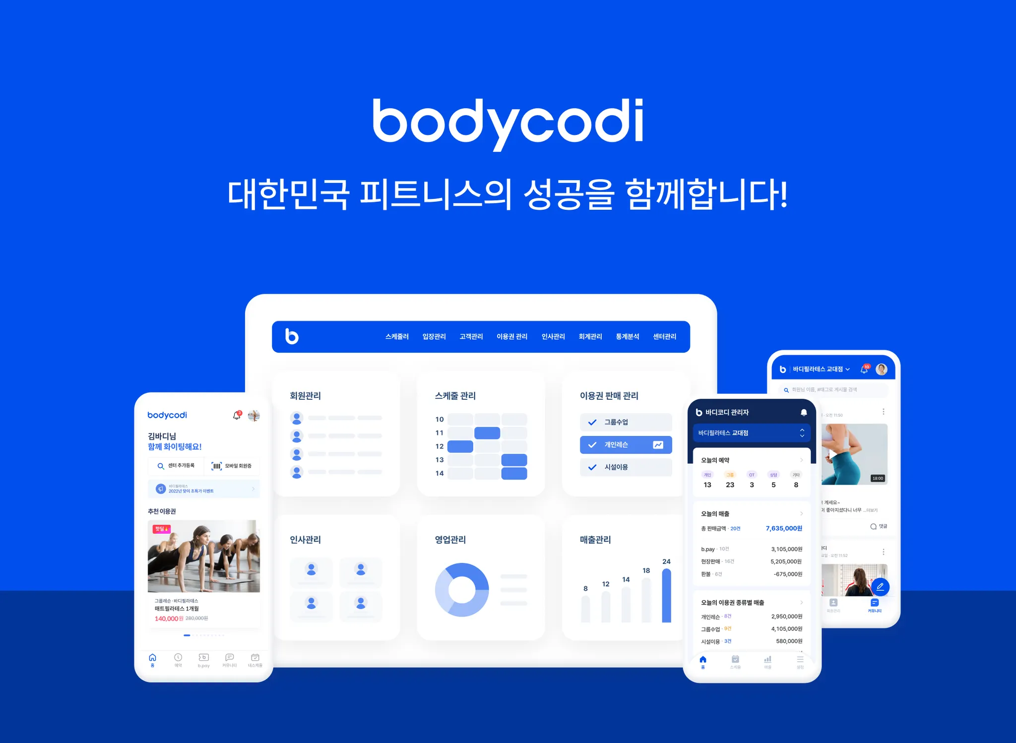 바디코디는 대한민국 피트니스 비즈니스의 멋진 성공을 위해, 센터와 3만 여 명의 강사, 100만여명의 회원을 연결을 통해, '더 나은 조직문화, 더 효율적인 영업방식, 더 좋은 고객관계' 만들고 이로 인해 가맹점이 미래 피트니스비즈니스를 주도해갈 수 있도록 지원합니다.