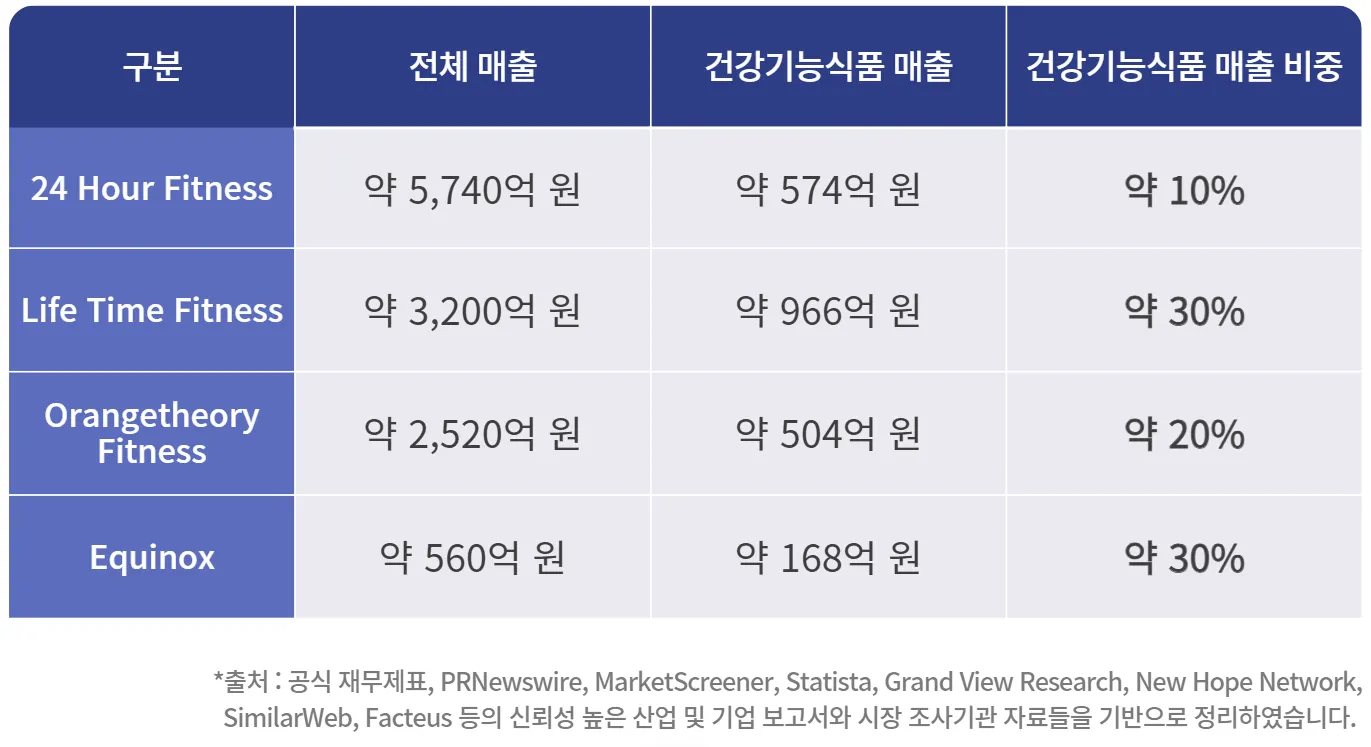 이미 글로벌 피트니스 업계에서는 맞춤형 건강기능식품 패키지, 온/오프라인 판매 채널, 멤버십/구독 서비스 등 다양한 형태로 건강기능식품 시장의 매출 비중을 높여가고 있습니다.