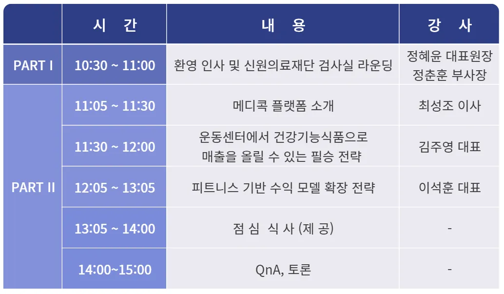 이번 세미나를 통해 국내 피트니스 업계에서 가장 빠르게 전담 영양관리사의 원격 상담과 국가 건강검진 데이터 기반으로 맞춤식 영양제 솔루션에 대한 정보를 확인하고 우리 센터에서 공급할 수 있는 기회를 잡아보세요!