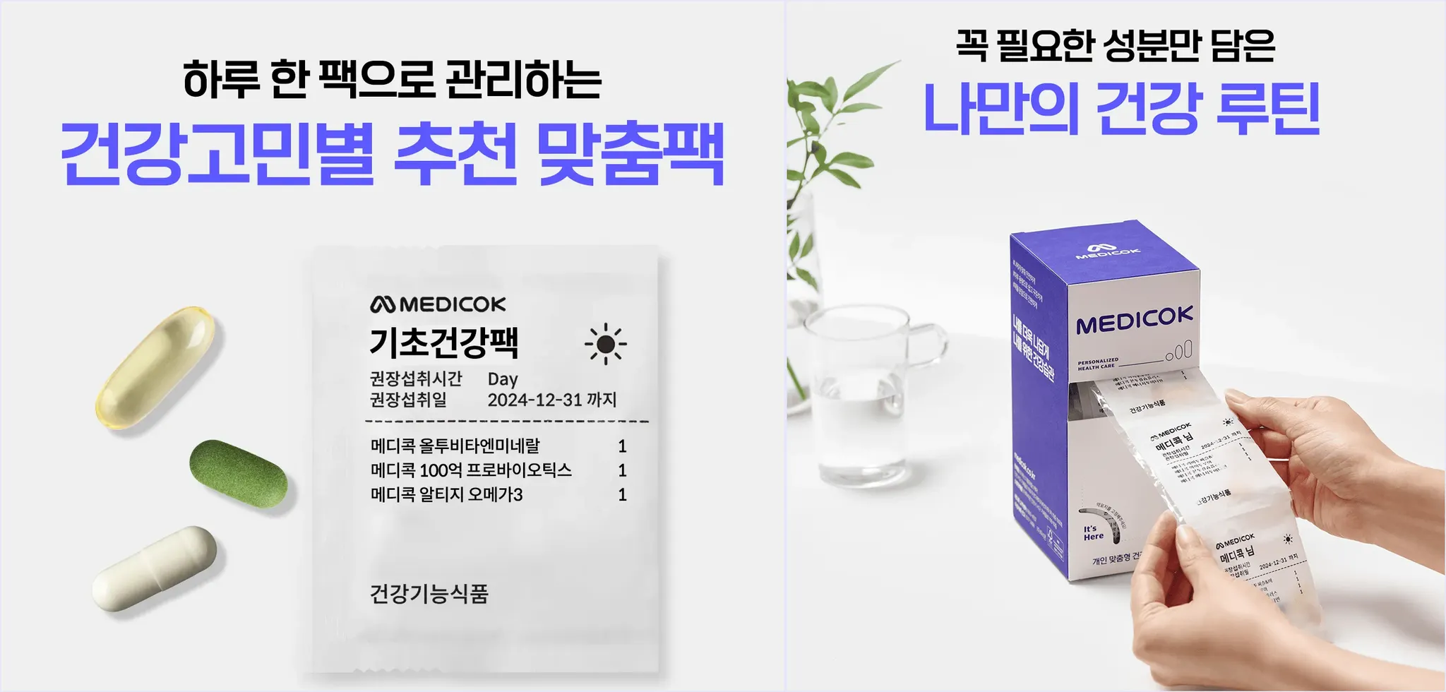 ‘국가 건강검진 데이터’를 기반으로 전문 영양관리사가 상담하고 꼭 필요한 건강기능식품들을 1일 단위로 소분 포장하여 한달 씩 구독하는 솔루션입니다.